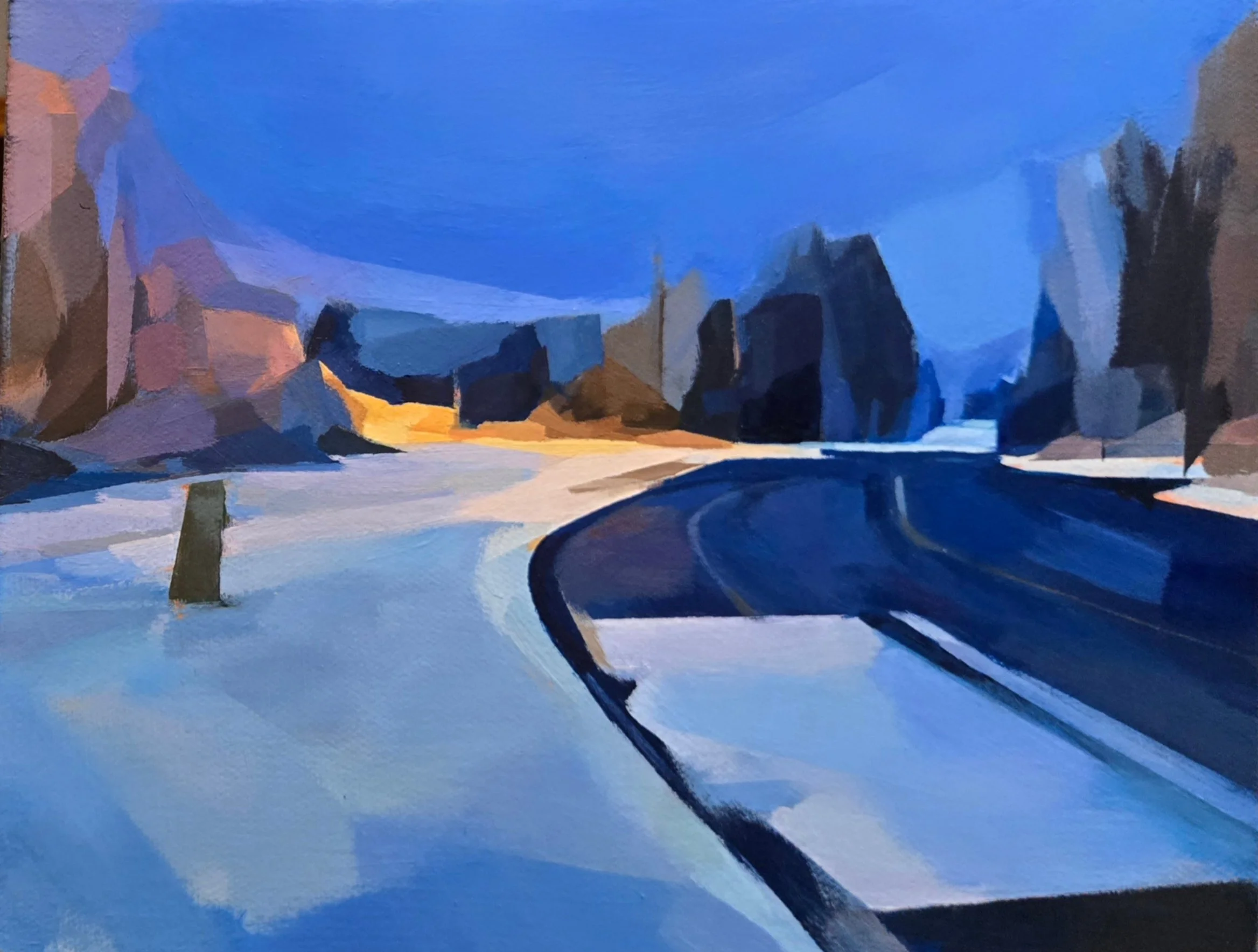 Colourful winter sunrise, one trail marker and a road leading away. A reminder to stop and enjoy the lovely moments in life before moving on. 14 x 18 Acrylic on canvas. SOLD